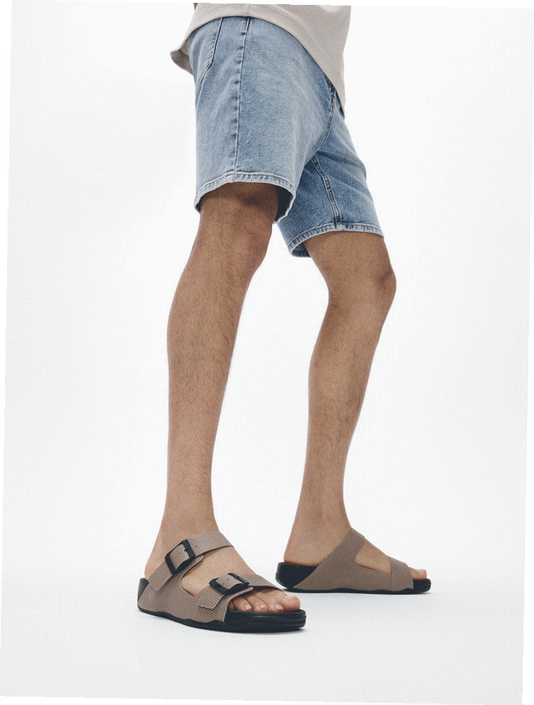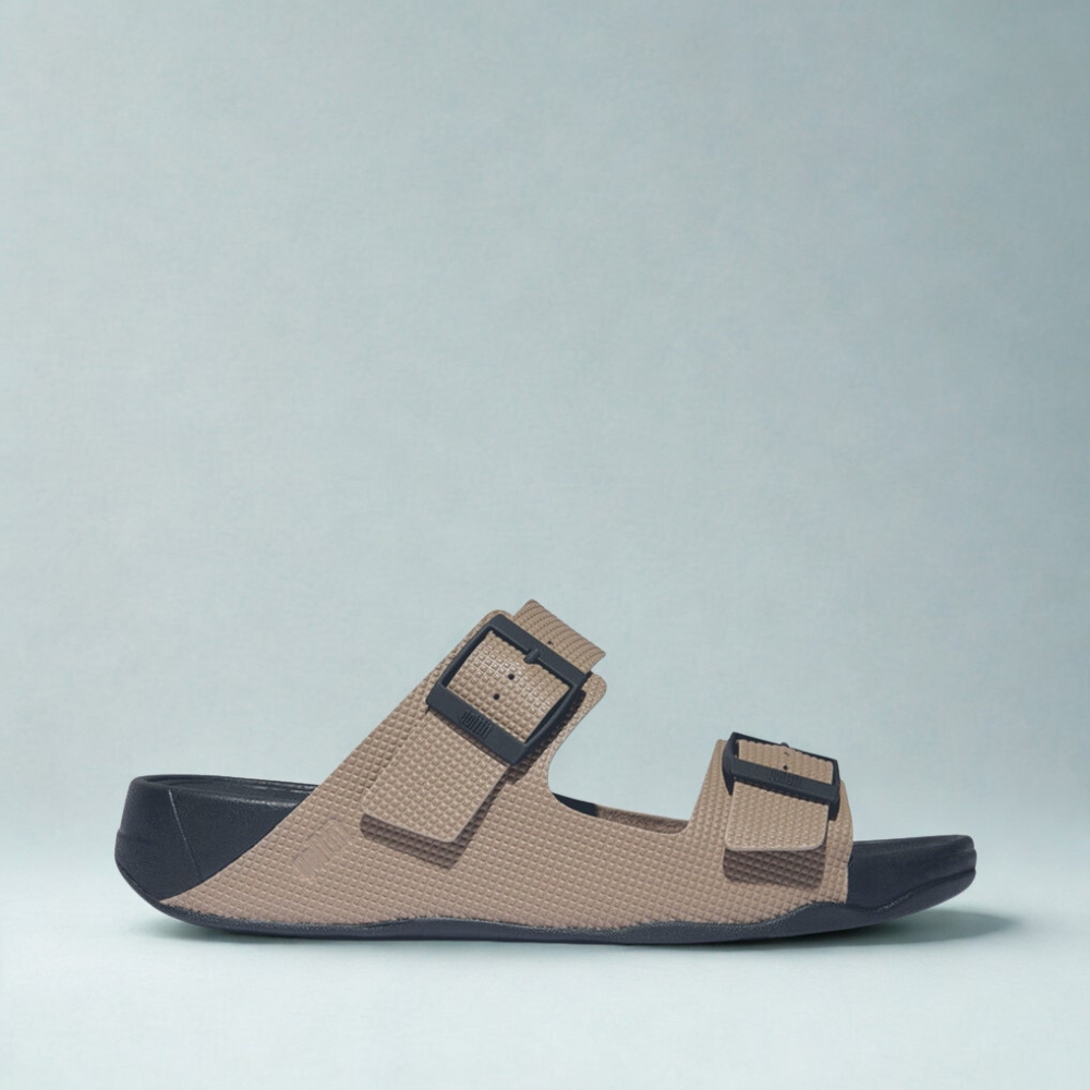 Looking for a pair of leather sandals that are both fashionable and comfortable for everyday wear? These two-strap sandals are the ideal choice. The classic design features two flexible adjustable straps, accompanied by a square buckle with a matte metallic finish for a subtle accent. This version is made from leather with a unique square embossed pattern, adding depth to the look.