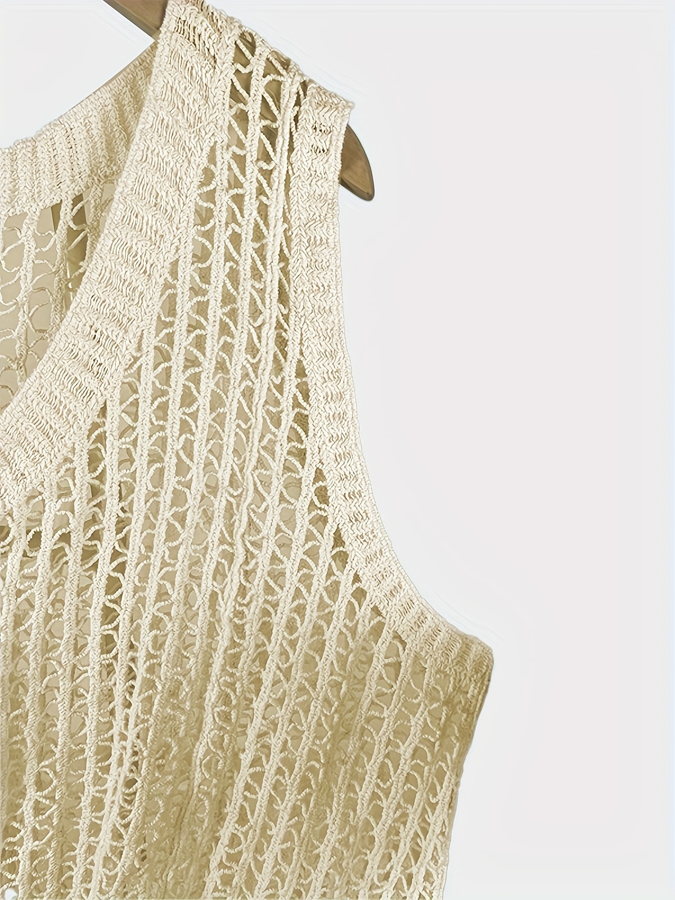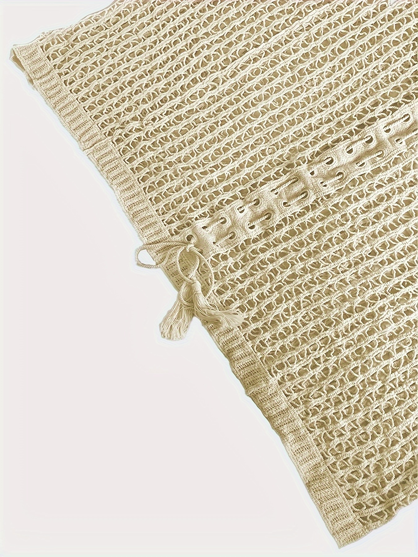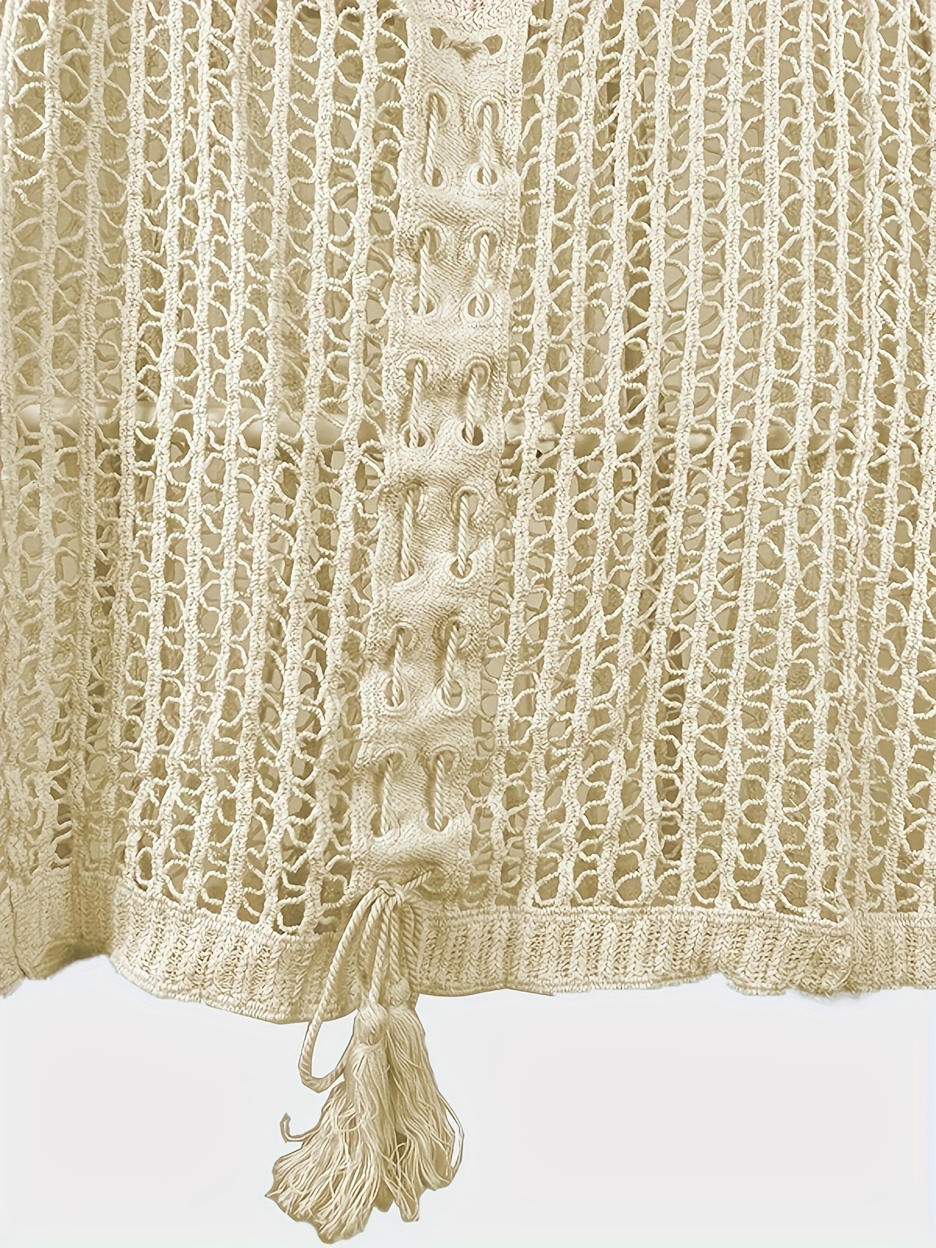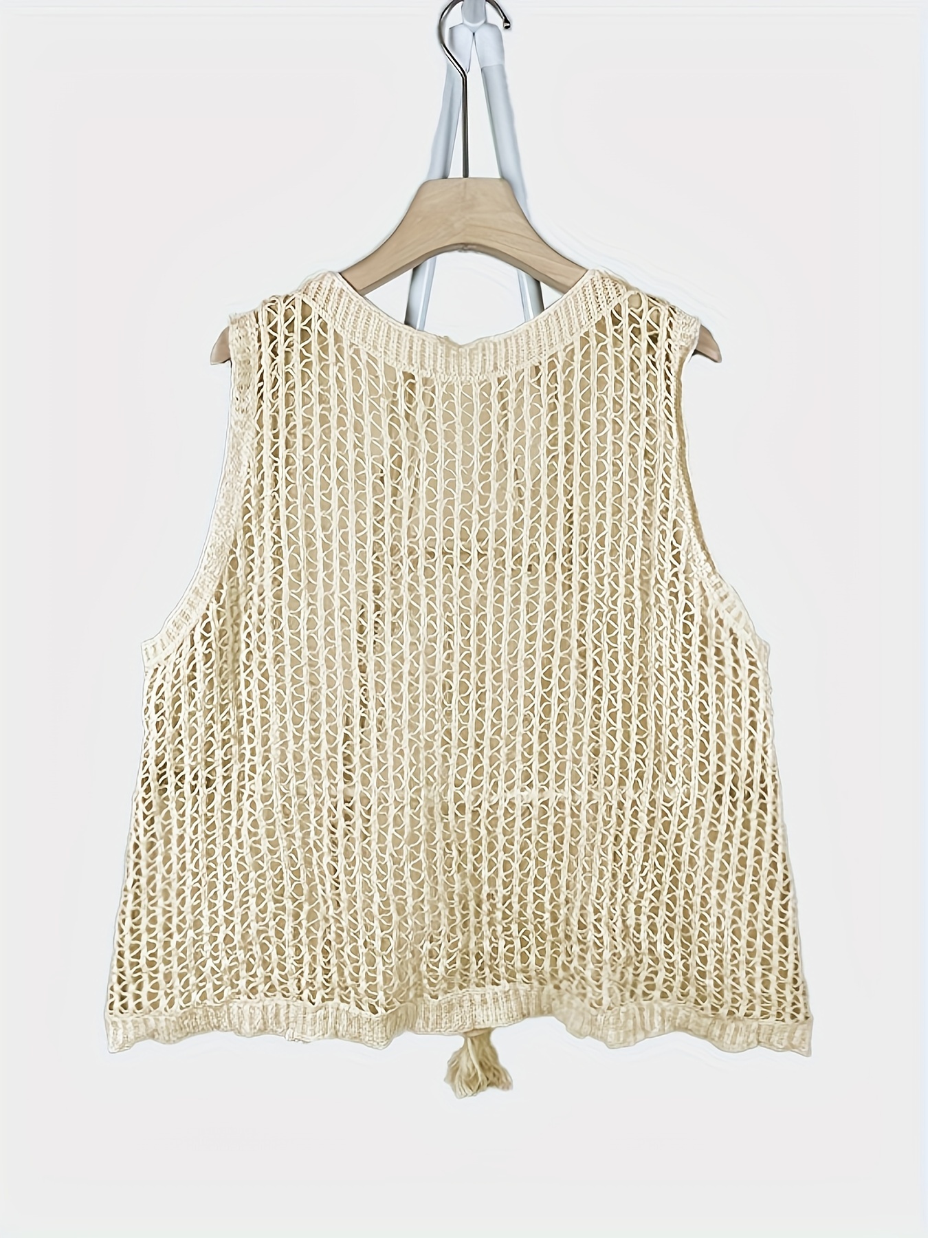 Women’s Beige Semi-Sheer Sleeveless Vest – V-Neck Drawstring Tassel Layering Top, Boho All-Season