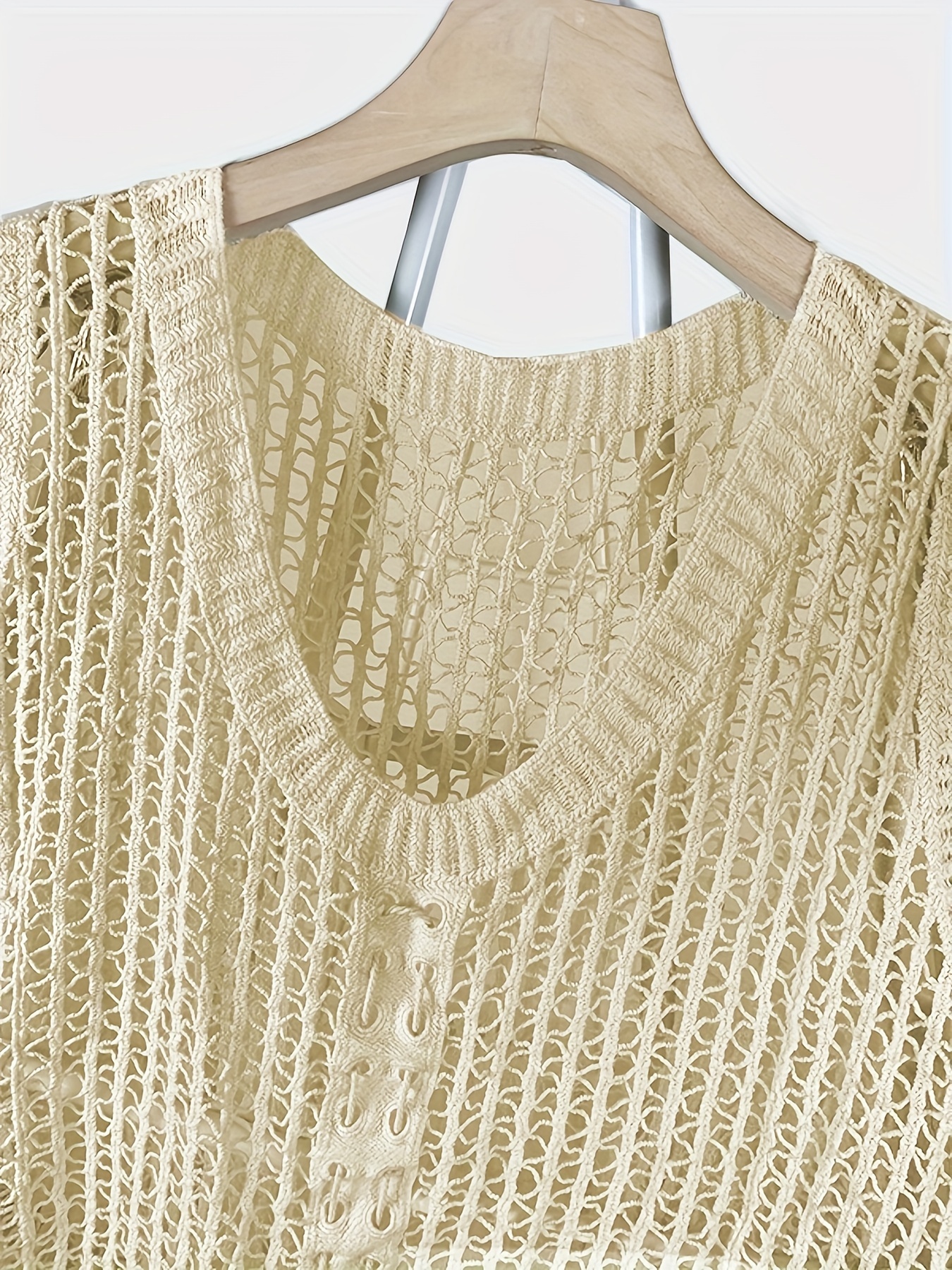Open-knit crochet in a soft cream tone. The stitch forms vertical “ladder” rows of oval eyelets linked by twisted loops, creating a breathable mesh. A ribbed trim finishes the scoop neckline and placket, which is accented with elongated looped stitches for a handcrafted, airy look.