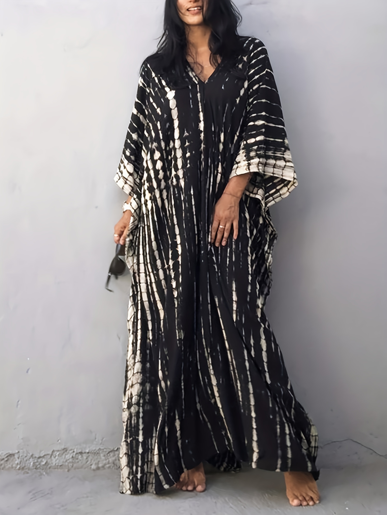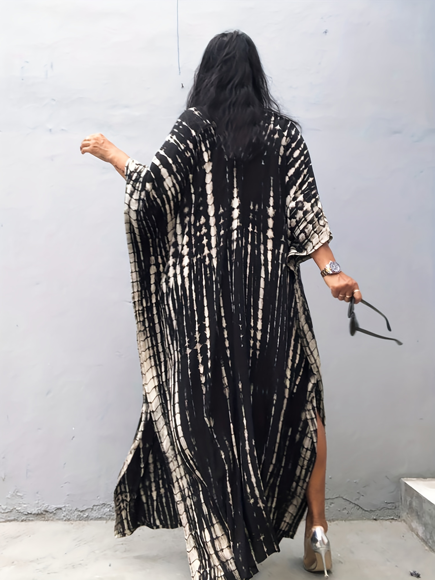 Black with ivory tie-dye (shibori-style) stripes—irregular vertical streaks and dotted bands radiating from the neckline and sleeves for a hand-dyed, boho look.