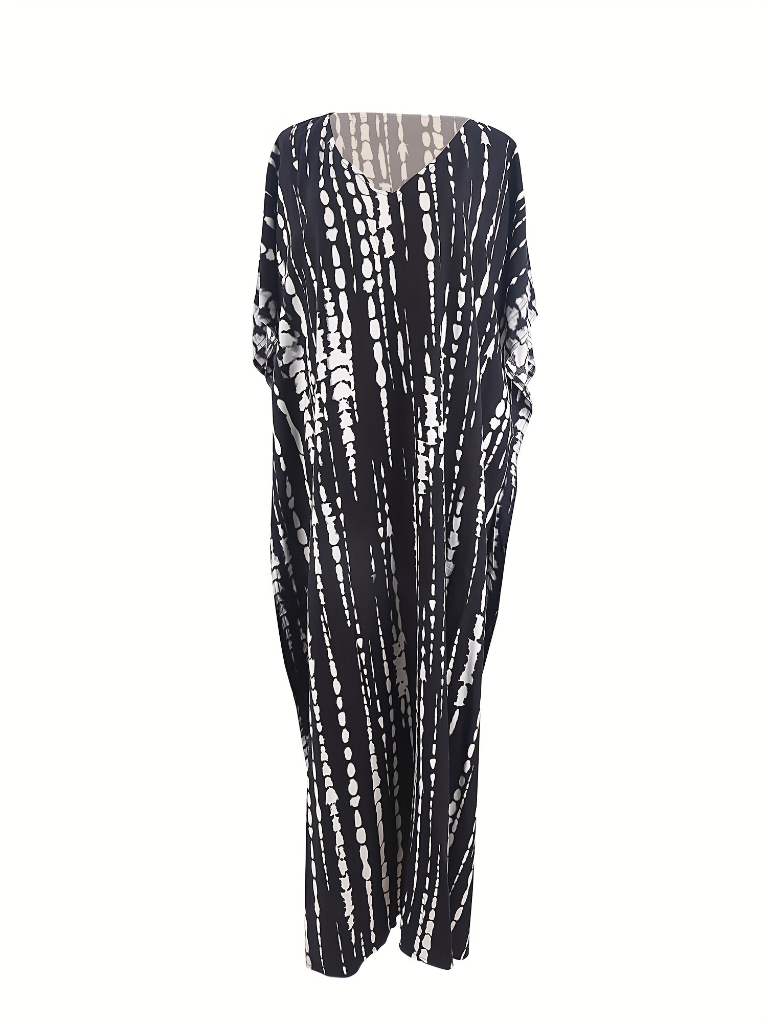 Women’s Elegant V-Neck Turkish Kaftan Dress – Loose Fit Viscose Long Robe with Side Slit, All-Season Striped Print