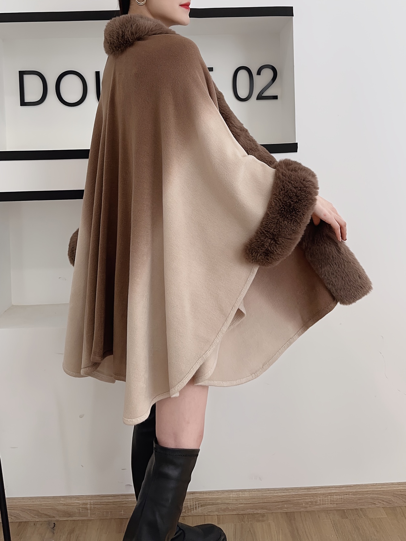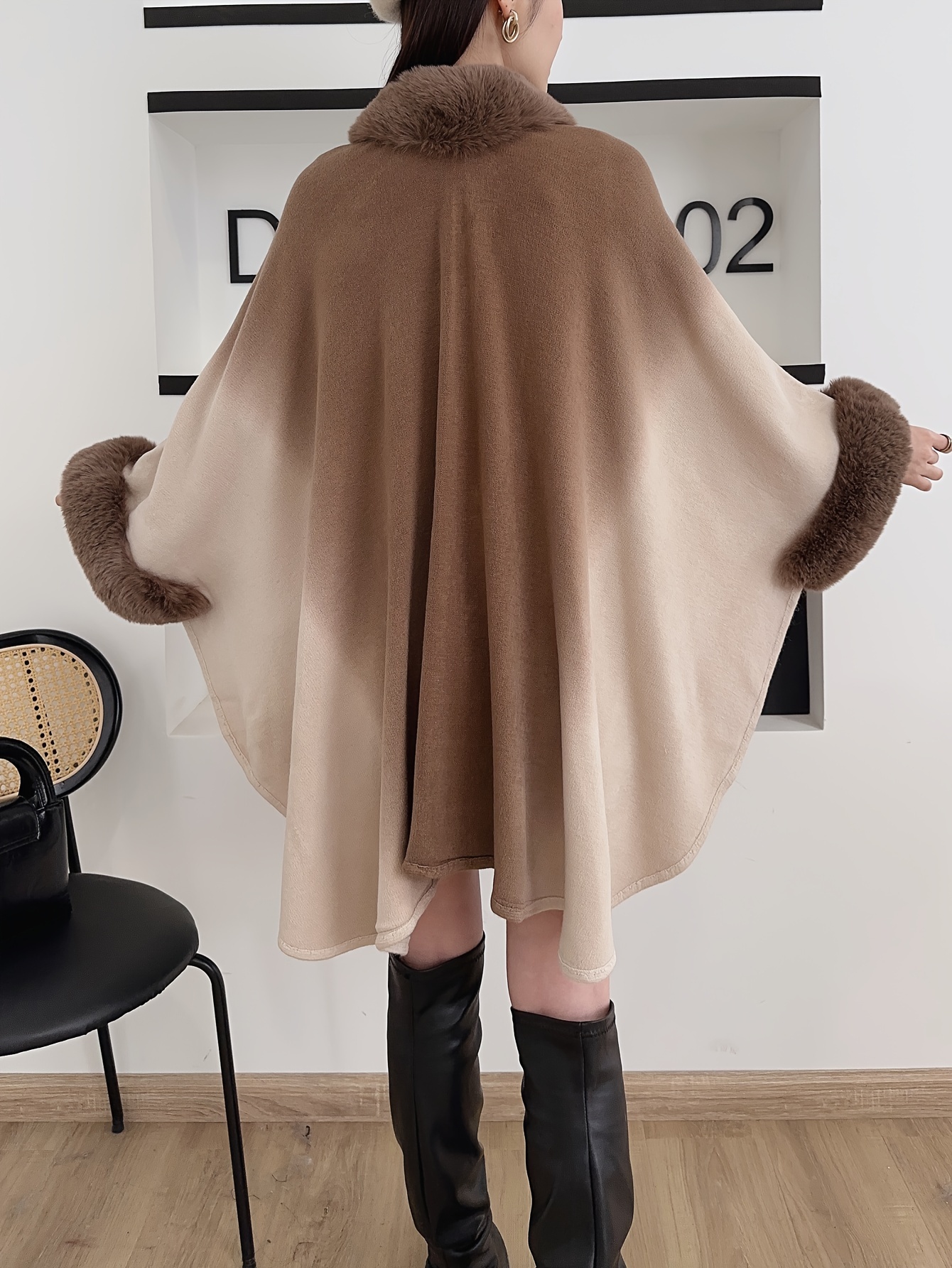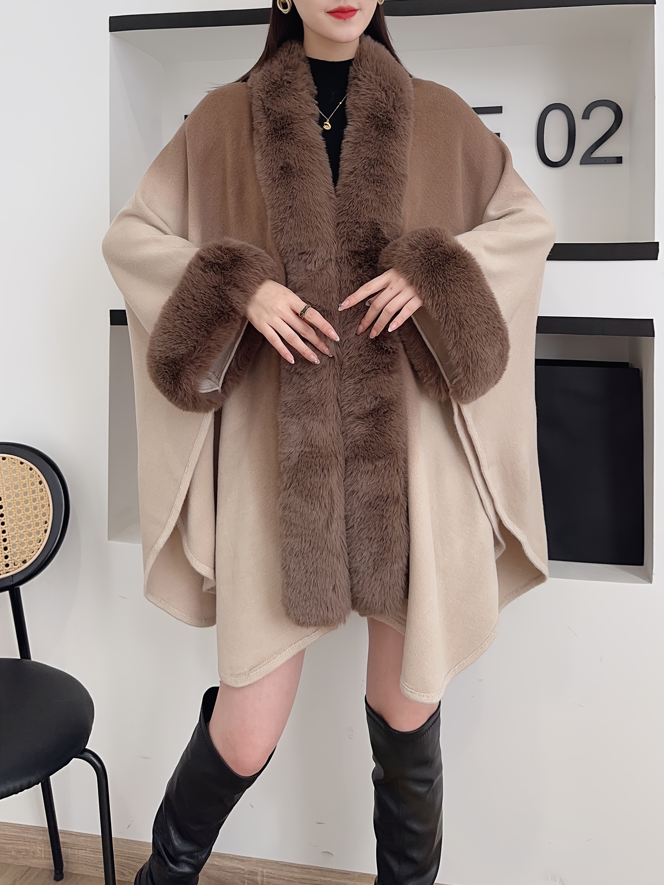 Women’s Oversized Cape Coat with Faux Fur Collar – Gradient Black/Grey Wrap Shawl, Plush Trim, Korean-Style Elegant Winter Outerwear