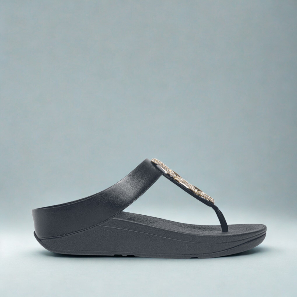 DESCRIPTION:Eland Trendy’s Fino sandals feature a slightly tapered toe, a lightly cushioned sole, and a soft leather toe box. Innovative Microwobbleboard™ sole technology reduces impact and distributes pressure, providing superior all-day comfort. Designed with a simple faux leather material, decorated with a square crystal chain